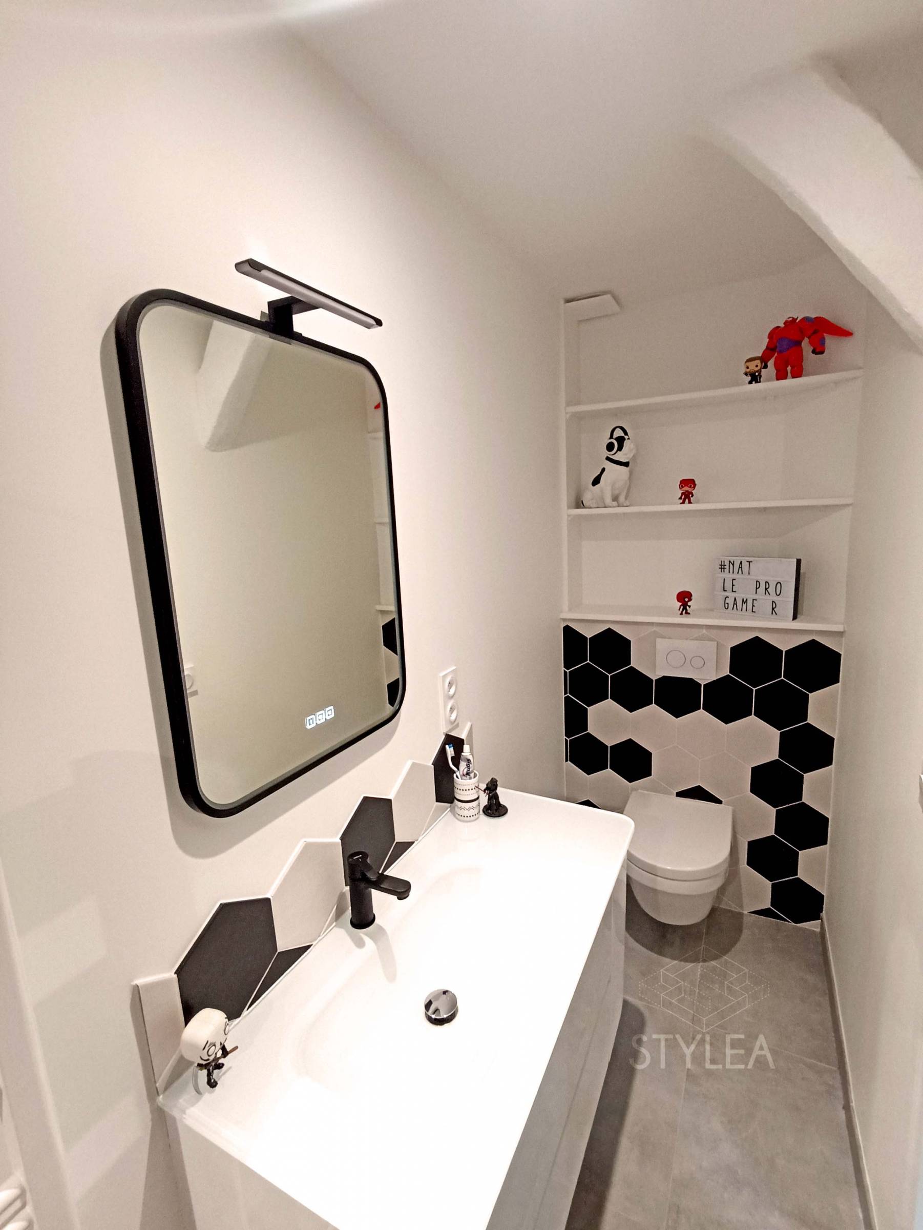 Le dernier chantier concerne la salle d’eau du plus jeune de la famille. En effet, cette salle d’eau sans fenêtre avait besoin de respirer un peu mieux. Ainsi on joue la carte de la géométrie en noir et blanc pour ce jeune garçon. On optera pour un meuble vasque plus léger et moins encombrant pour alléger l’ensemble.